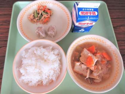 12/17(火) 今日の給食 公開日 2024/12/17 更新日 2024/12/17 旭東+(プラス) 今日のメニューは、ご飯、牛乳、シュウマイ2個、生揚げの中華煮、切り干し大根の中華サラダでした。