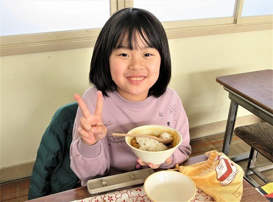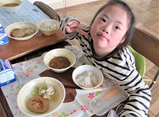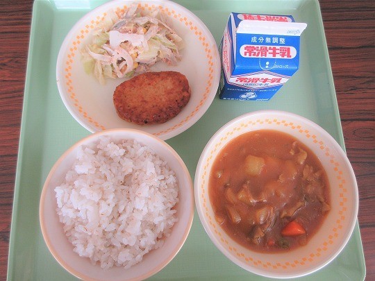 今日のメニューは、麦ご飯、牛乳、米粉のカレーライス、豆腐ハンバーグのあんかけ、蓮根とごぼうのサラダでした。