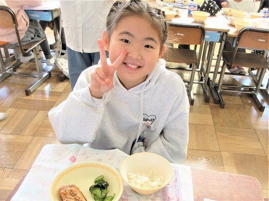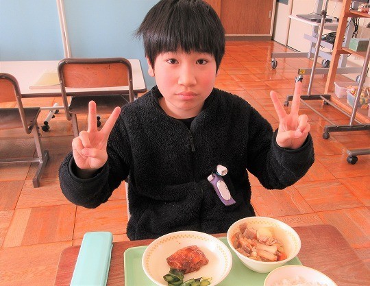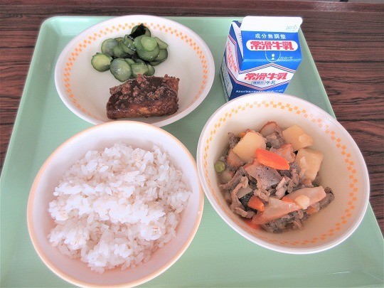 今日のメニューは、麦ご飯、牛乳、けんちん篠田の肉味噌掛け、肉じゃが、キュウリとわかめの和え物でした。