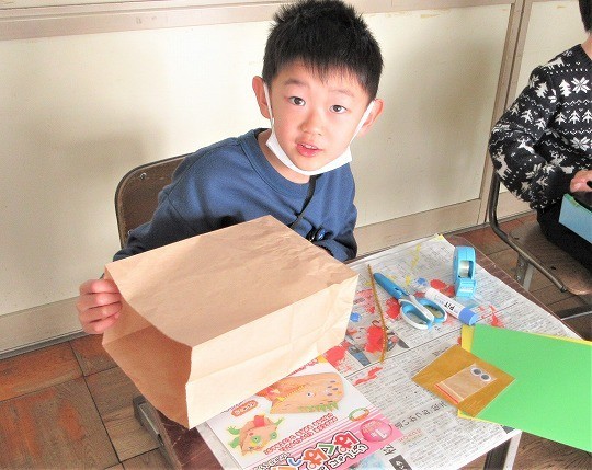 紙袋の形を変えて、いろいろな姿を作り、ぱくぱくできる作品を作ります。