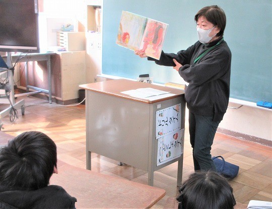 1/23(木) 読み聞かせ 公開日 2025/01/23 更新日 2025/01/23 旭東+(プラス) 読み聞かせボランティアの森山さんと竹内さんにお出でいただき、2年生と6年生に読み聞かせをしていただきました。どちらの学年もお話に引き込まれ、集中して聞いていました。