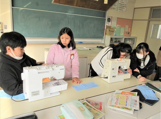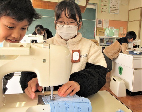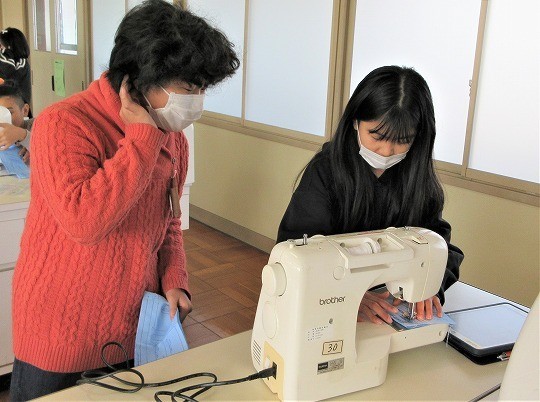 まっすぐ縫う、返し縫い、方向転換など、練習用の布を使って各自で練習していました。