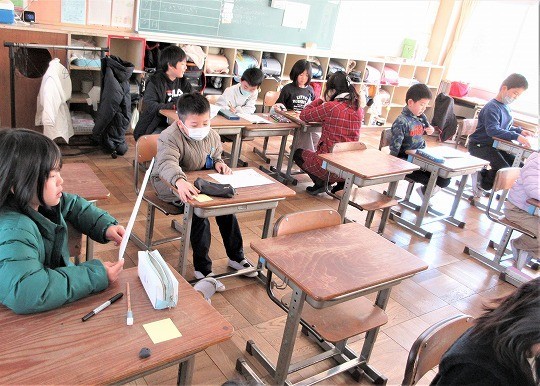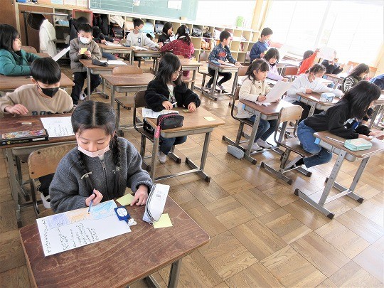 表現のよいところを付箋に書いて友達の作品にはり、回していました。