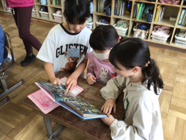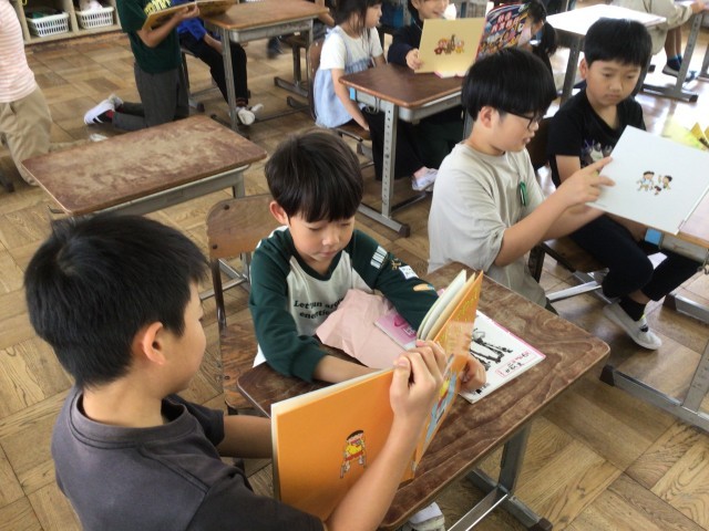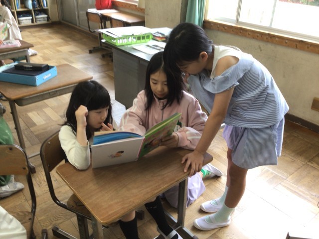 2年生が本の世界を楽しみるように、5年生は声をや表情を変え、工夫しながら読み聞かせをしています。