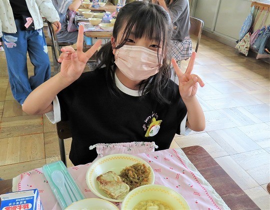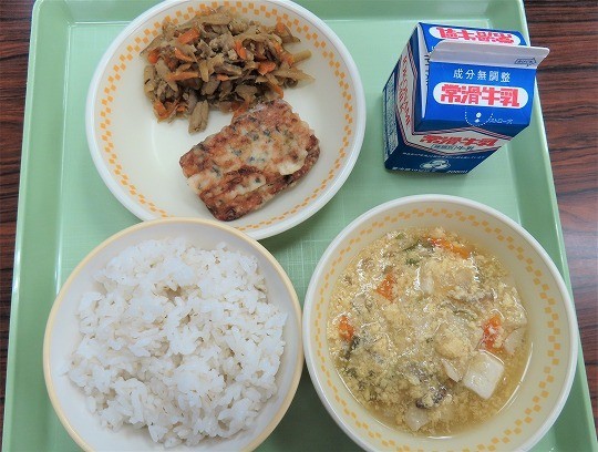 麦ご飯、牛乳、揚げ五目豆腐、きんぴらごぼう、かき玉汁でした。