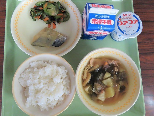 5/28(水) 今日の給食 公開日 2025/05/28 更新日 2025/05/28 旭東+(プラス) 今日のメニューは、ご飯、牛乳、サワラの西京焼き、キュウリのシソひじき和え、実だくさん汁、ヨーグルトでした。