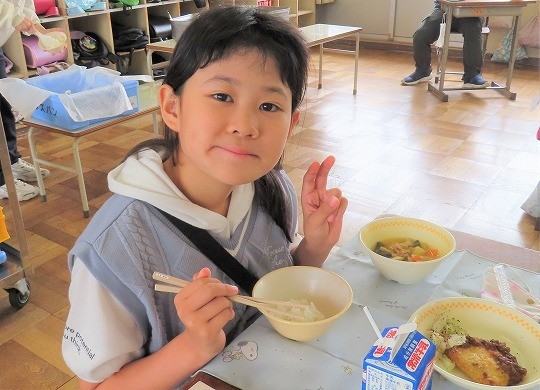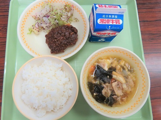 6/11(水) 今日の給食 公開日 2025/06/11 更新日 2025/06/11 旭東+(プラス) 今日のメニューは、ご飯、牛乳、けんちん篠田の肉味噌かけ、キャベツの赤じそ和え、実だくさん汁でした。