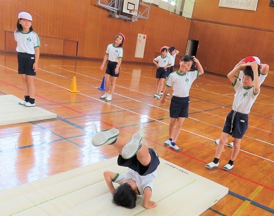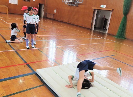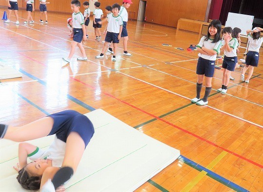 前転、開脚前転、ゆりかご、後転、開脚後転から少なくても2つ選んで発表します。