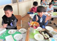 今日のメニューは、麦ご飯、牛乳、鶏肉とレバーの揚げ煮、野菜とツナの和え物、ナスの味噌汁でした。