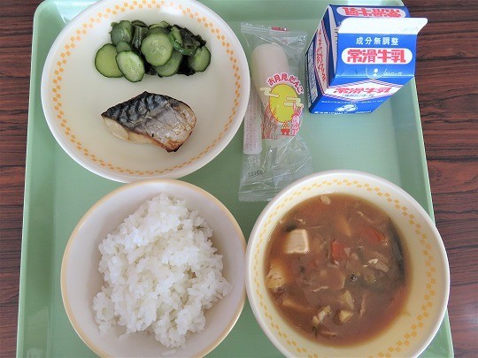 今日のメニューは、ご飯、牛乳、サバの塩焼き、キュウリとわかめの和え物、里芋の味噌汁、月見団子でした。