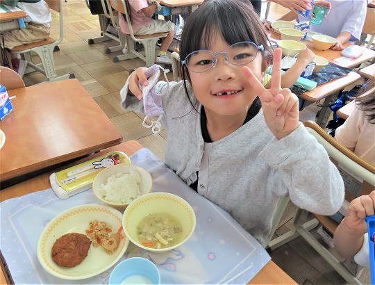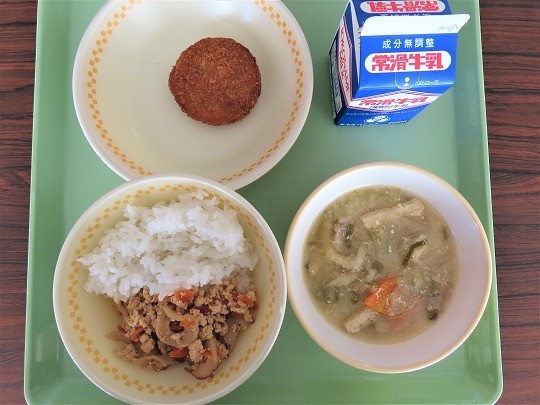 今日のメニューは、ご飯、牛乳、鶏飯の具、和風コロッケ、呉汁でした。
