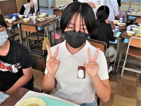 今日のメニューは、ご飯、牛乳、サバの塩焼き、キュウリとわかめの和え物、里芋の味噌汁、月見団子でした。