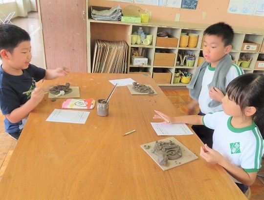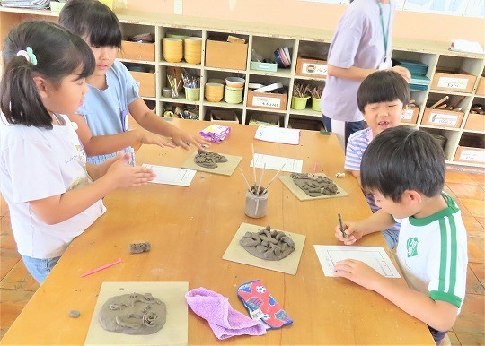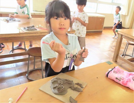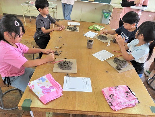 平たく伸ばした粘土に飾り付けをし、自分だけのネームプレートが完成しました。
