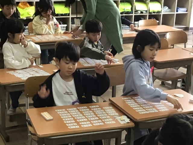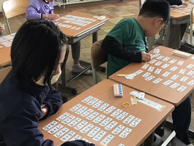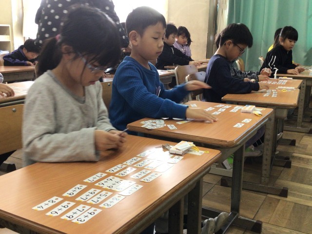 1年生は計算カードを活用して、くり上がりの計算の練習中。