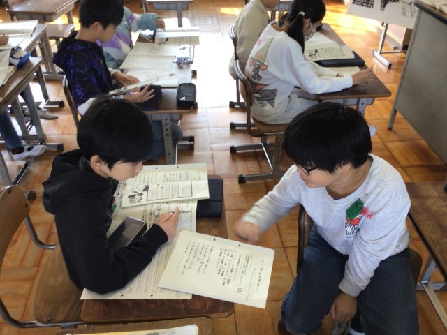 5年生の音楽では、沖縄の音階やリズムの特徴を生かしたふしづくりをしていました。