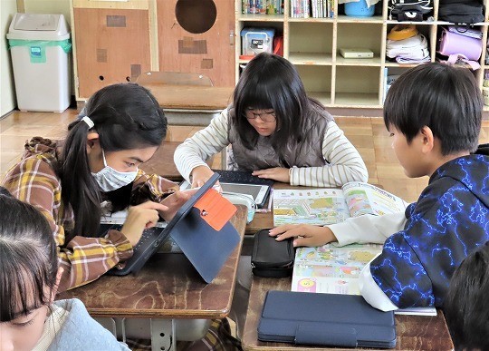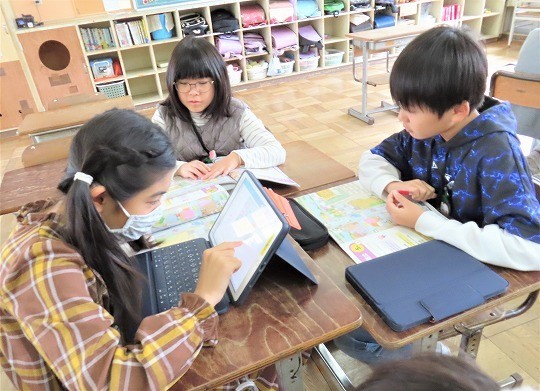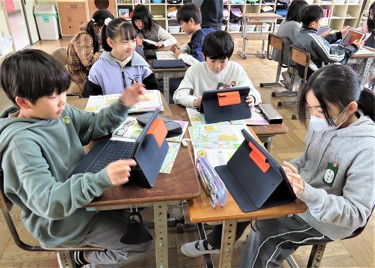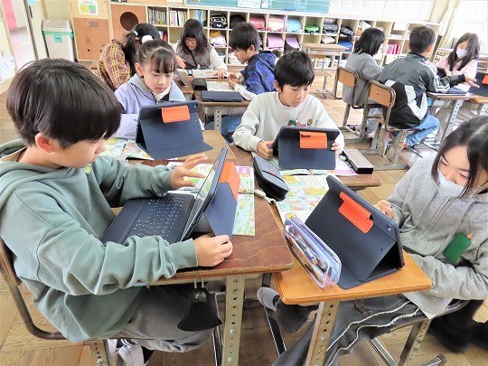 有田焼、江戸切り子、赤べこなど、各自が興味をもった工芸品について、タブレットで魅力を調べ、まとめていました。