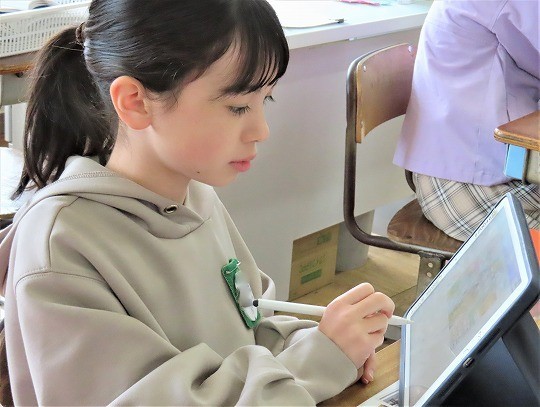 今日は、自分が作ったおもちゃの魅力をタブレットを使ってスライドを作っていました。