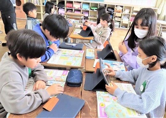 タブレット上で教科書の絵を共有し、グループでけがや事故が起きそうなところとその理由を話し合っていました。