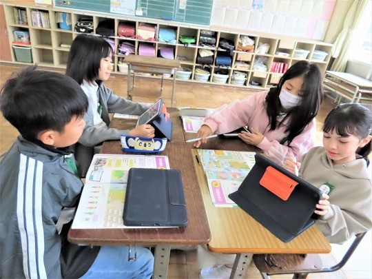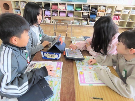 教科書の挿絵を見て、わかることをグループで話し合っていました。