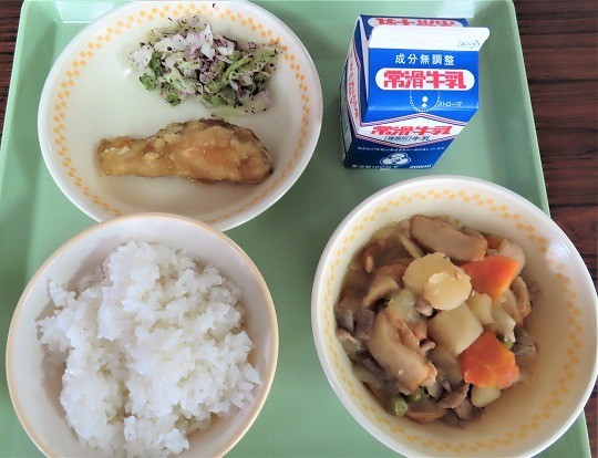 ご飯、牛乳、揚げ魚(鱈)の甘酢あんかけ、肉じゃが、キャベツの赤じそ和えでした。