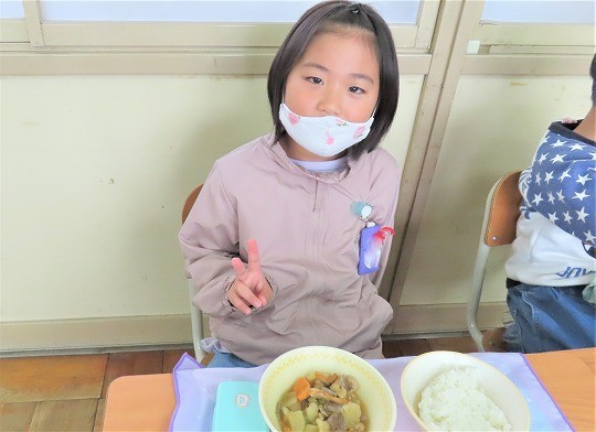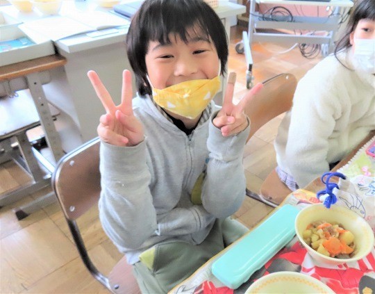 今日のメニューは、ご飯、牛乳、サツマイモコロッケ、親子煮、野菜のおかか和えでした。