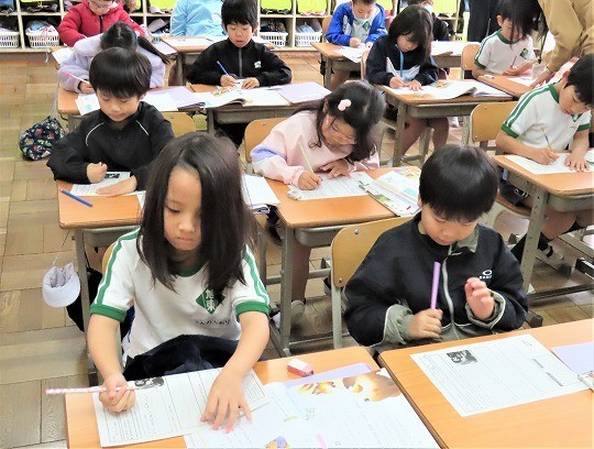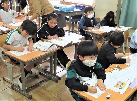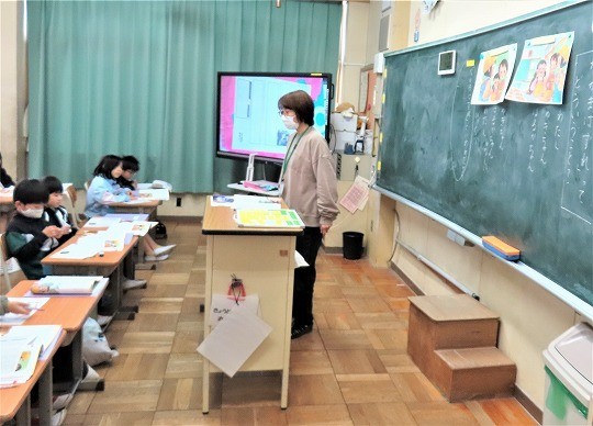 1年生の音楽は、「フルーツケーキ」「ねこのはなし」「わくわくキッチン」「たきび」などを歌っていました。