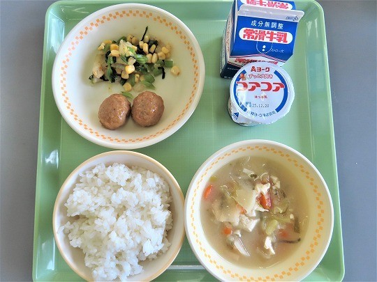 ご飯、牛乳、レバー入りつくね2個、野菜のおかか和え、石狩汁、ヨーグルトでした。
