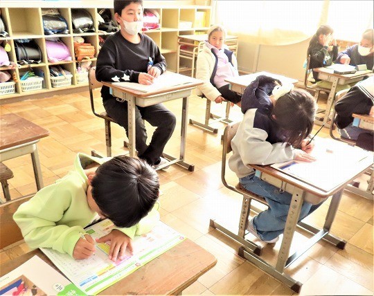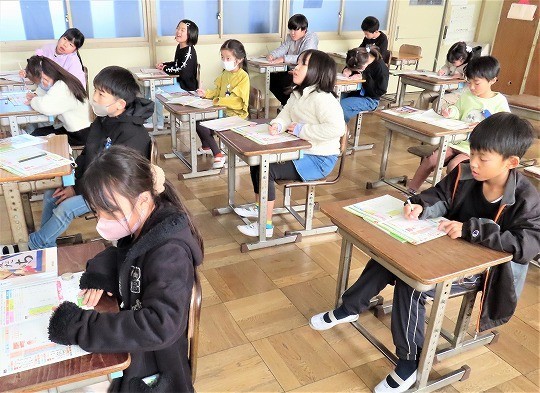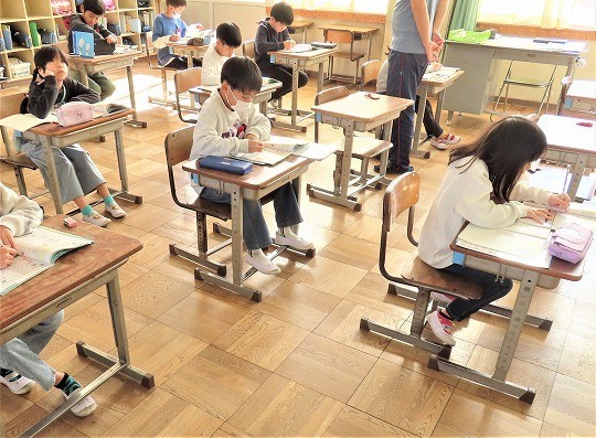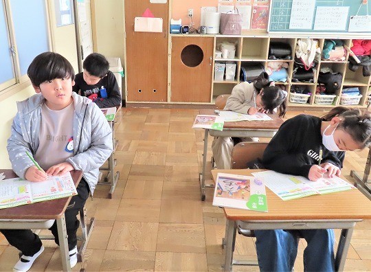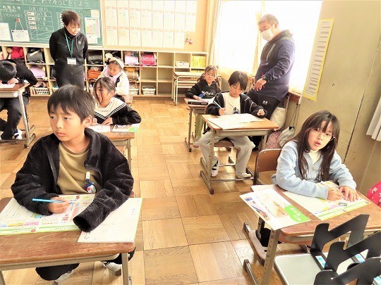 3年生の書写では、年賀状を書く学習をしていました。