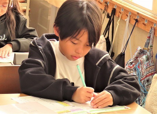 はがきの書き方を学びながら、家族に送る年賀状の内容を考えていました。