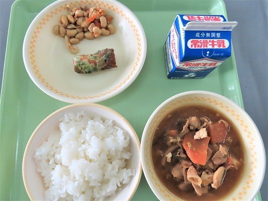 今日のメニューは、ご飯、牛乳、ちくわの米粉磯辺揚げ、煮豆、豚汁でした。