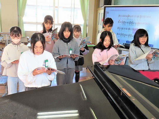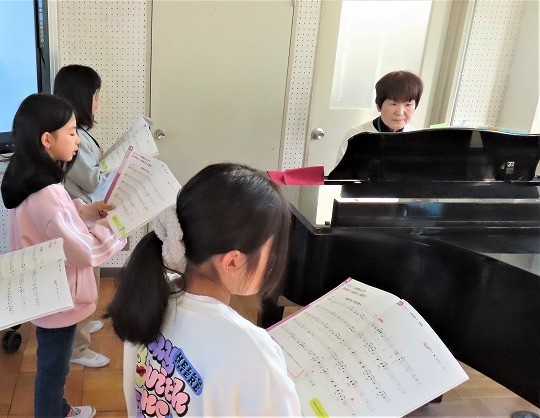 ピアノの周りに集まって歌唱練習をしていました。