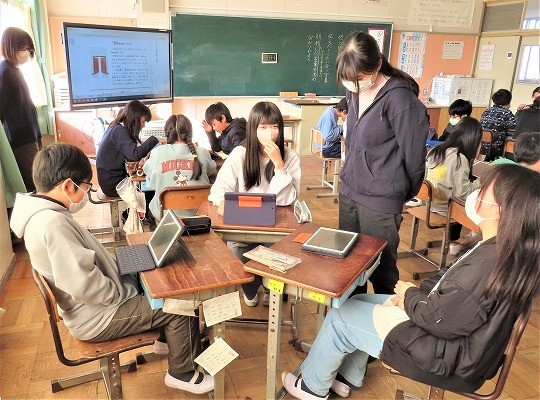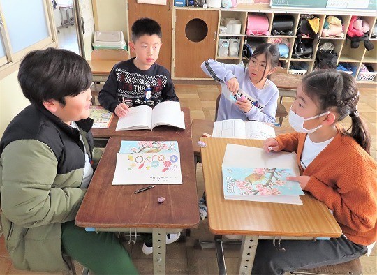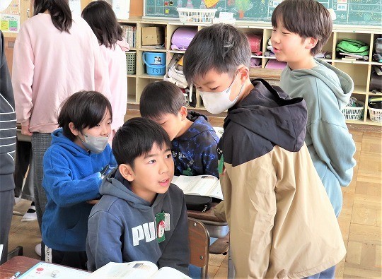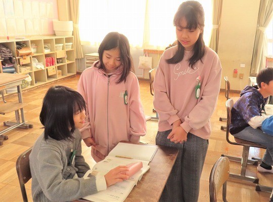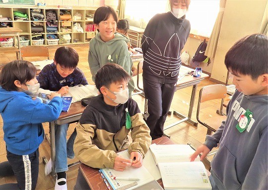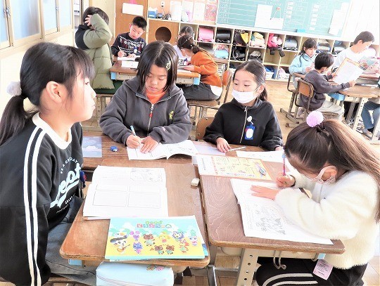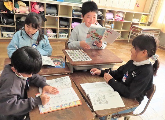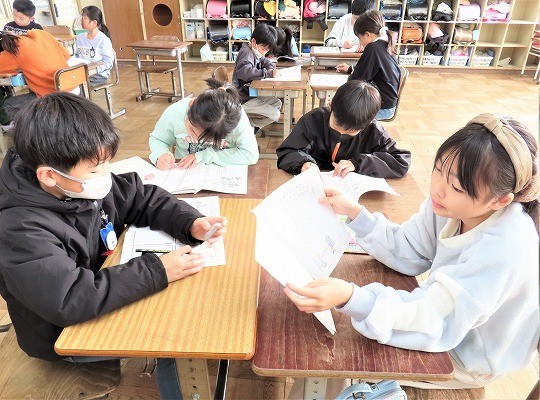 グループ内で友だちの文章を読み、感想を伝え合っていました。