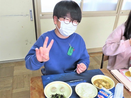 今日のメニューは、麦ご飯、牛乳、米粉のカレーライス、鱈のハーブ焼き、大根サラダでした。