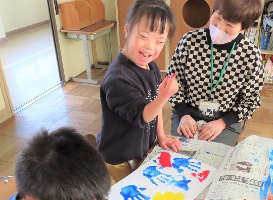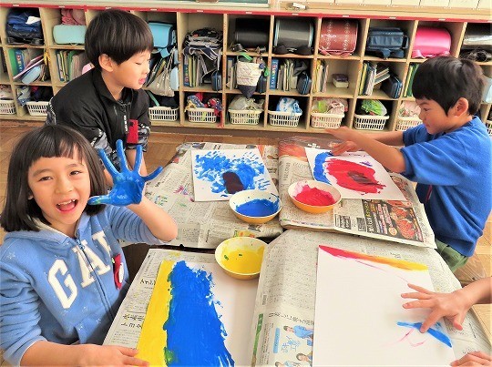 絵の具を手や指につけて描きながら、表現を楽しんでいました。