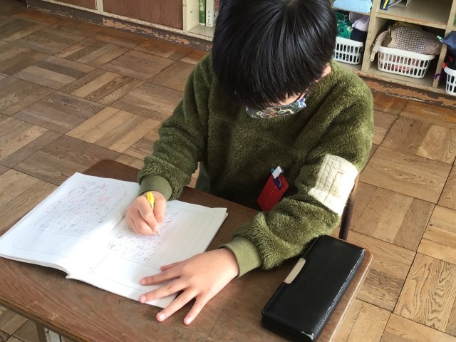 課題は、「元気な子」です。中心に気をつけて書いていました。