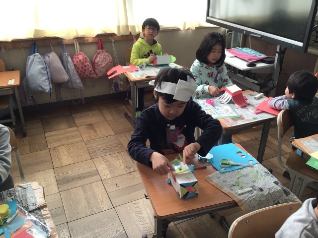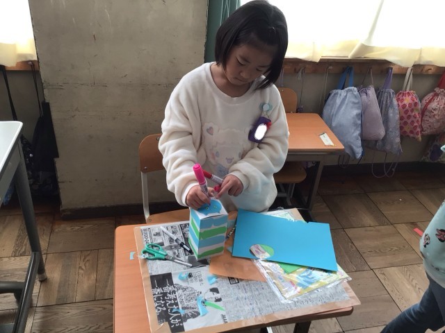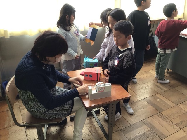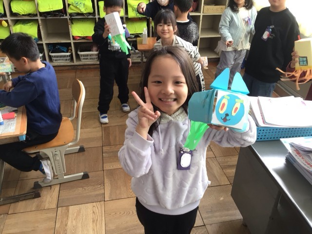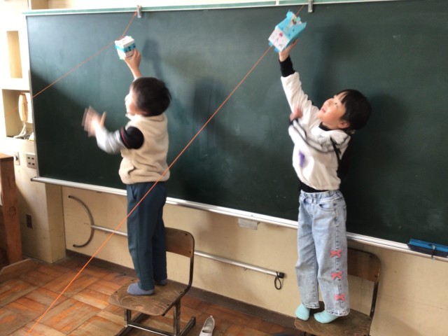 今日は図工の時間に、「スルスル ビューン」の作品作りをしました。箱を、思い思いに飾り、そこにクリップを付け、紐で滑らせる作品です。滑る速さや作品の動きが面白く、タブレットで動画を撮るなど、楽しみながら活動することができました。