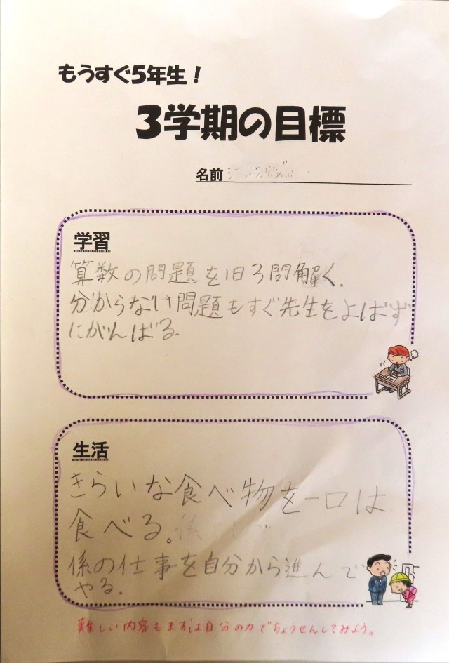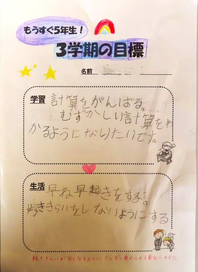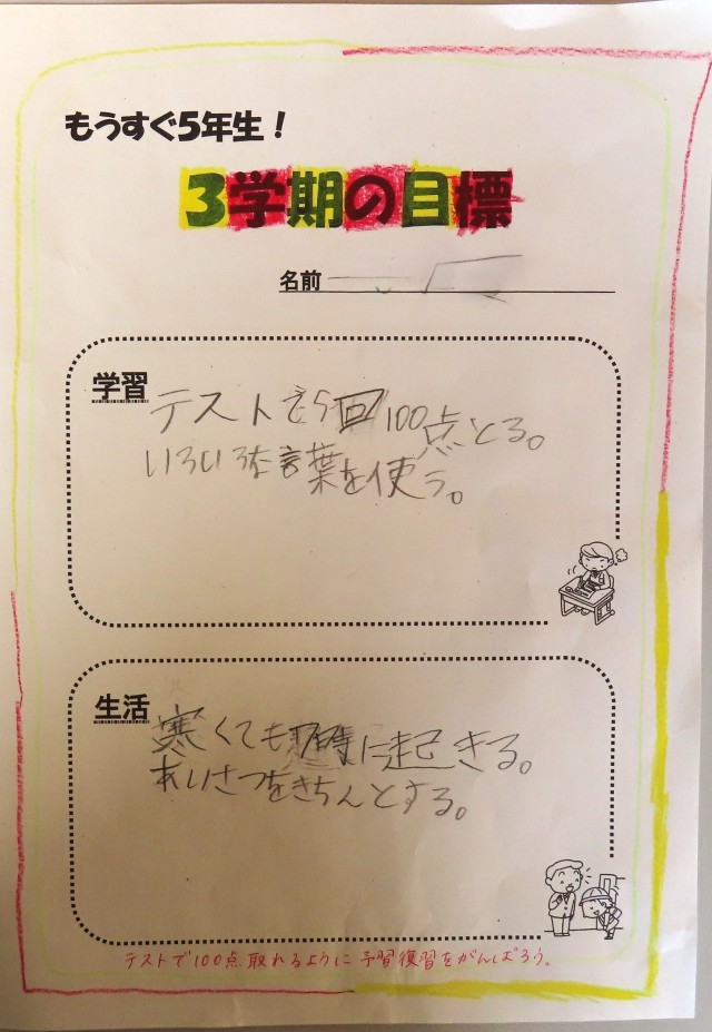 めあてをもって毎日の生活に取り組み、中学生になる力を蓄えられるとよいです。