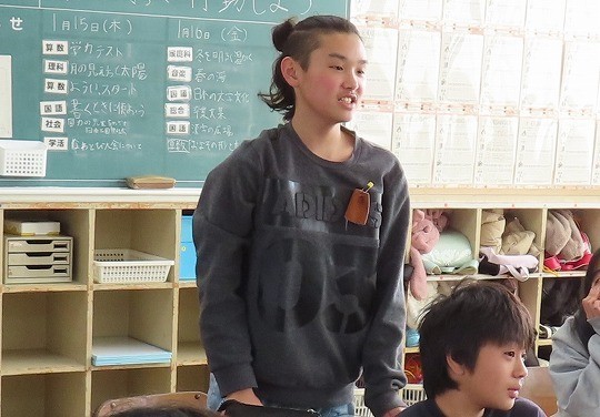 映像で見た問題の出し方を参考にして、自分たちの問題についてヒントの出し方を話し合っていました。