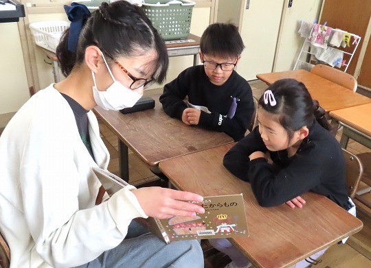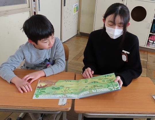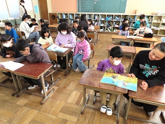 6年生の優しい読み聞かせに、1年生は真剣に耳を傾けていました。