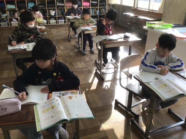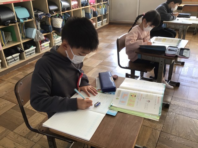 2年生の国語は、復習問題をプリントで解いていました。