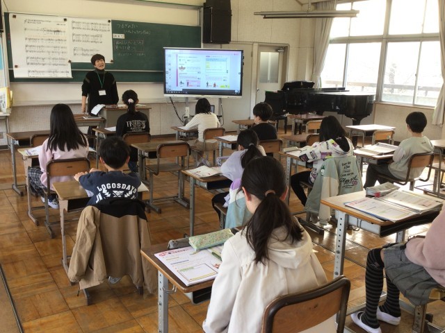 耳を澄ませ、楽器の音色や速さ、リズムなどを感じながら、曲のおもしろいと思うところに着目して鑑賞をしています。