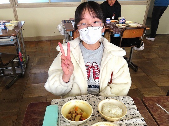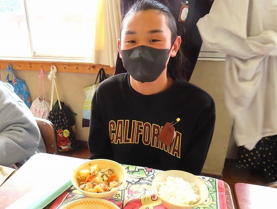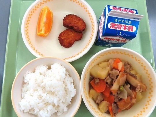 今日のメニューは、ご飯、牛乳、大豆入りナゲット2個、肉じゃが、不知火でした。