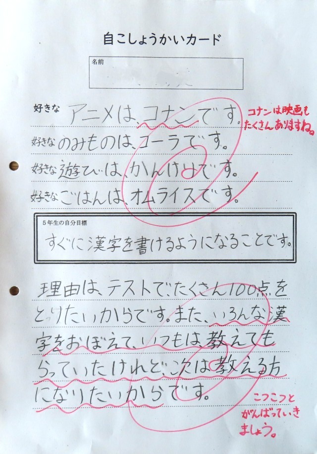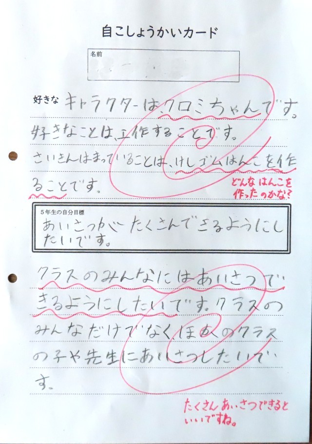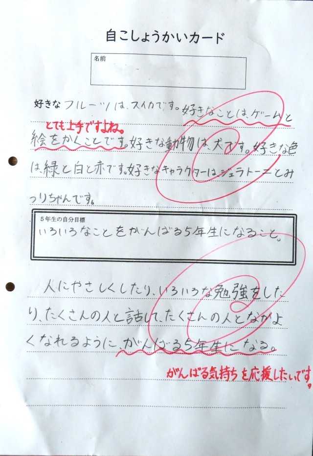 自己紹介とともに、各自の5年生となった意気込みが書かれています。
