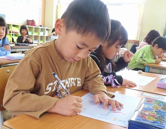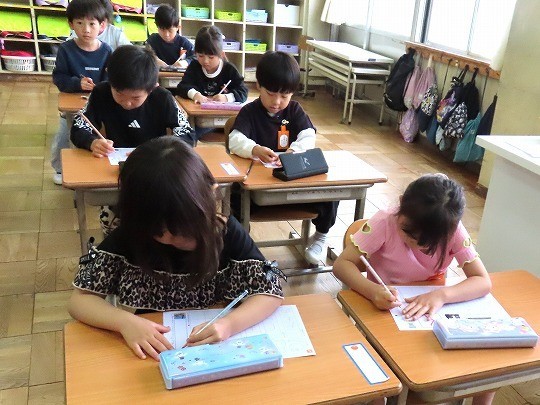 今日は「く」です。空書きをして、「くし、くま、くじら、くだもの」など「く」から始まる言葉を書く練習をしていました。