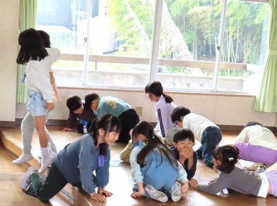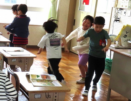 伴奏に合わせて歌ったあと、各自が選んだリズムを曲に合わせて打ち、同じリズムを選んだ仲間を探していました。