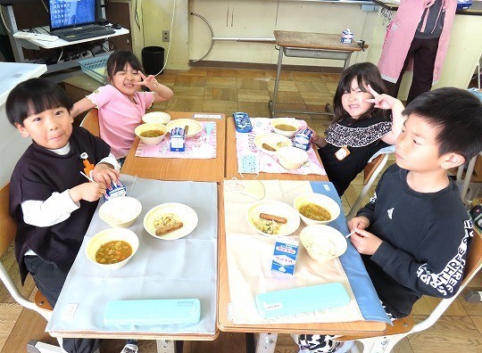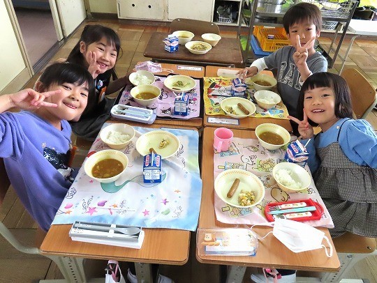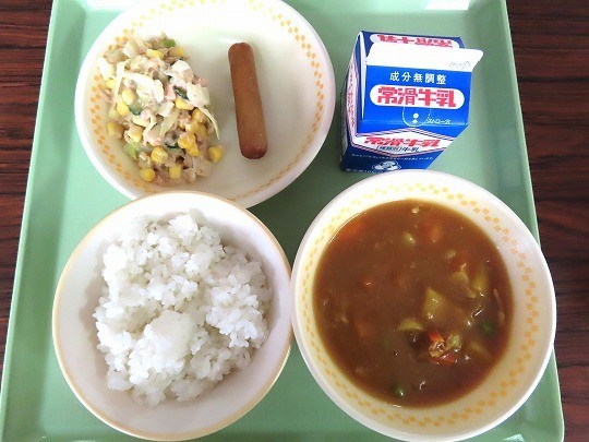 今日のメニューは、ご飯、牛乳、米粉のカレーライス、焼きウインナー、ツナサラダでした。