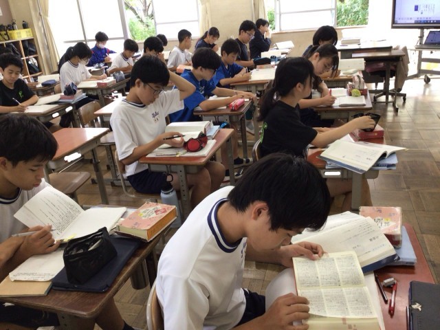 詩の学習です。気になった言葉を紙の辞書で調べています。本校の国語科は辞書をよく使っています。前後の言葉も調べられるので、紙の辞書はお勧めです!