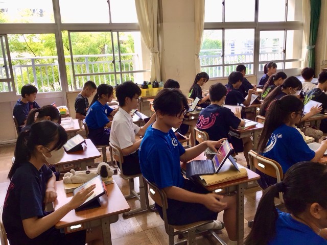 授業の振り返りをタブレット端末で行っています。最初はうまく繋がらなくてどきどきでしたが、あとからうまくいったかな?