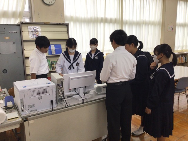 昼休みの図書館を開館するために、毎回図書委員が職員室に鍵を取りにきます。今日はどんな感じかなと思って出向いてみたら、パソコンの不具合が発生!でも、図書委員がすぐに職員室に担当の先生を呼びに行って、事なきを得ました。先生もすぐに駆けつけてくれてよかったですね。