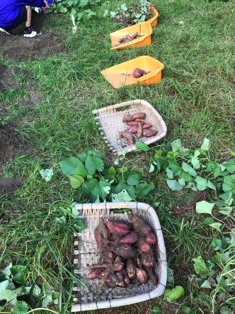 雨が上がって、サツマイモの収穫、第2弾です。見に行ったときは序盤でしたが、すでにたくさんの収穫がありました。今後、大学いもづくりに使われるそうです。楽しみですね。